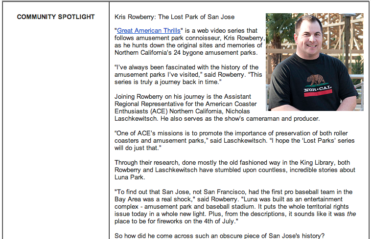 “Great American Thrills” is a web video series that follows amusement park connoisseur, Kris Rowberry, as he hunts down the original sites and memories of Northern California’s 24 bygone amusement parks.