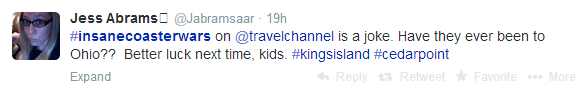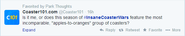 At issue with most coaster and park enthusiasts (who make up a large number of the viewing audience) however, is the continued downgrade in quality of the traditional summer “coaster show” over the past few years. “Insane Coaster Wars” is just the latest in a string of low budget, low quality productions from powerhouses like the Travel Channel and Discovery. Just look at some of the reactions from last night’s debut: