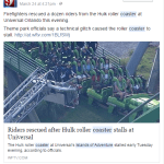 UPDATE: A statement from Park Public Relations Manager, Sue Carpenter: “The issue was caused by a tree branch fell on the track of the roller coaster obstructing the train.